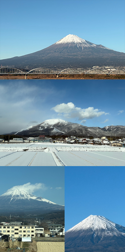 1月、京都に行った際に新幹線の車中から富士山を撮影しました。場所によっては、雪が積もっていたり違う景色を楽しめました♪